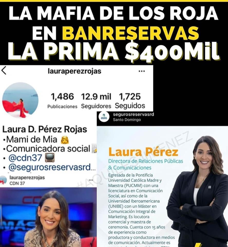 Laura Rojas Directora de Mercadeo y comunicaciones de Seguros Banreservas prima hermana 350 k de sueldo + bonos y Jeepeta asignada. Trabaja en CDN noticias también.